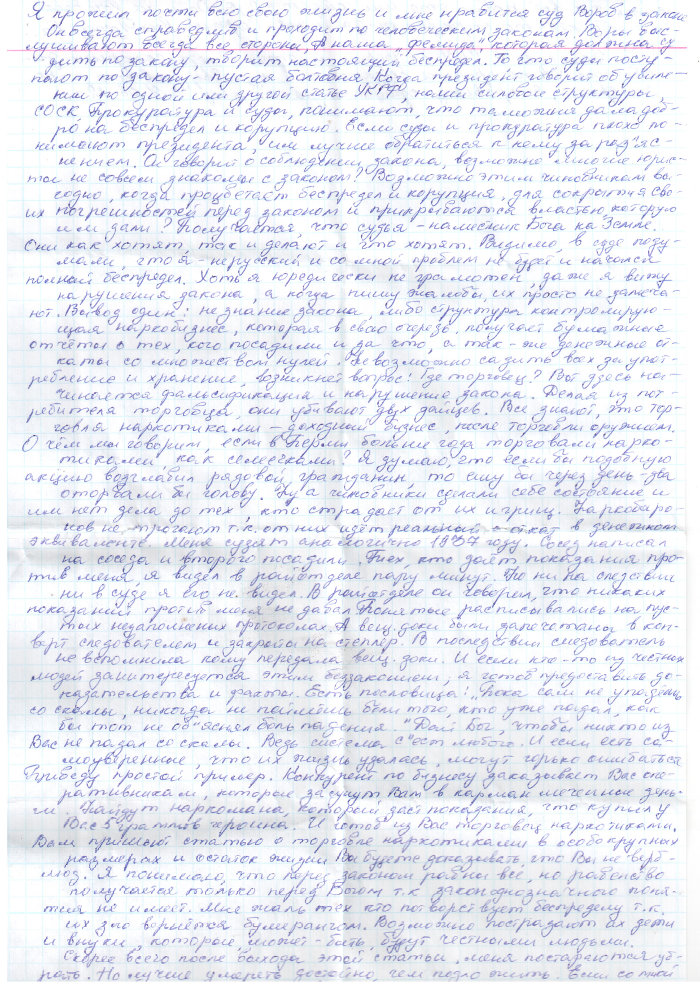 - Они как хотят, так и делают и что хотят. Видимо, в суде подумали, что я нерусский и со мной проблем не будет, и начался полный беспредел. Хотя я юридически неграмотен, даже я вижу нарушения закона, а когда пишу жалобы, их просто не замечают. Вывод один: незнание закона, либо структура, контролирующая наркобизнес, которая, в свою очередь, получает бумажные отчеты о тех, кого посадили и за что, а также денежные откаты со множеством нулей. Невозможно садить всех за употребление и хранение, возникает вопрос: «Где торговец?» Вот здесь начинается фальсификация и нарушение закона. Делая из потребителя торговца, они убивают двух зайцев. <...> Тех, кто дает показания против меня, я видел в райотделе пару минут. Но ни на следствии, ни в суде я его не видел. В райотделе он говорил, что никаких показаний против меня не давал. Понятые расписывались в пустых незаполненных протоколах. А вещ. доки были запечатаны в конверт следователем и закрыты на степлер. В последствии следователь не вспомнила, кому передала вещ. доки. И если кто-то из честных людей заинтересуется этим беззаконием, я готов предоставить доказательства и факты.