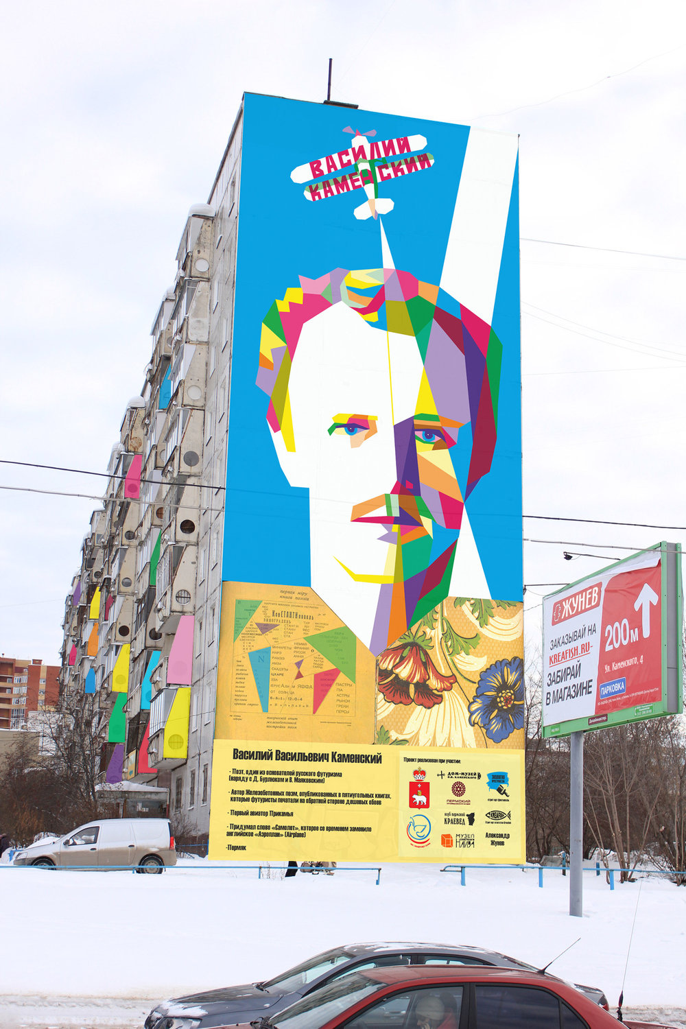В планах художника изобразить портрет пермского поэта-футуриста Василия Каменского. Место для размещения выбрано символичное – на фасаде многоэтажки по адресу улица Василия Каменского, 4 в микрорайоне Парковый. Как сообщил на сайте краудфандинга planeta.ru сам художник, деньги на реализацию проекта выиграны в рамках конкурса социальных проектов городской администрации "Город - это мы". Однако в процессе подготовки работы выяснилось, что перед нанесением рисунка необходимо произвести ремонт межпанельных швов на фасаде дома.