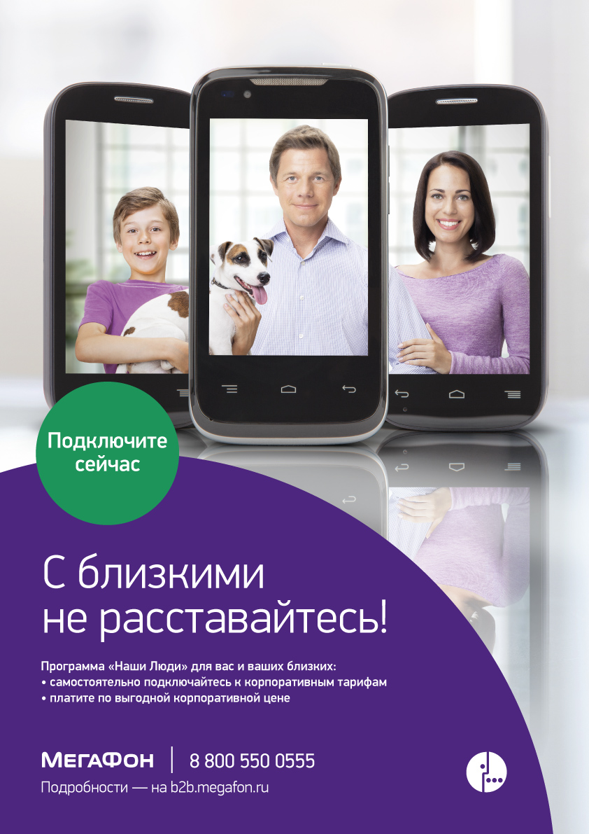 Отметим, что каждому абоненту — участнику программы «Наши люди», при подключении одноименной опции, бесплатно предоставляется 60 минут в месяц для звонков другим членам группы (сотрудникам организации, подключенным к корпоративным тарифам, а также родственникам - участникам программы «Наши люди»). Для подключения опции необходимо набрать USSD-команду *105*76#. Абонентская плата и плата за подключение данной опции отсутствует. Подробности предложения на сайте www.megafon.ru