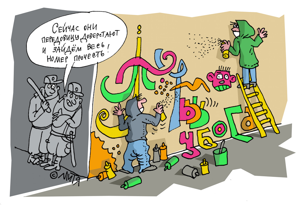 «Парламентарии пермского Законодательного собрания во втором чтении рассмотрели и приняли закон, согласно которому уличные «художники», оставляющие оскорбительные записи на городских стенах и заборах, отныне приравниваются к средствам массовой информации – и несут за свои действия соответствующие наказания. К примеру, надпись «Депутаты – воры» будет квалифицирована как клевета, а также оскорбление чести и достоинства государственного чиновника. Любой депутат, принявший надпись близко к сердцу, в этом случае будет иметь все основания, чтобы подать иск о репутационном ущербе, нанесенном «наскальной живописью». Еще один важный момент: кроме непосредственно авторов оскорбительных граффити к судебной ответственности также будут привлечены владельцы поверхностей, на которых исполнены данные художества. Владелец магазина, на фасаде которого нечаянно образовалось «художество», выступит как пособник вандализма и будет считаться заказчиком информационной атаки, пока не доказано обратное».