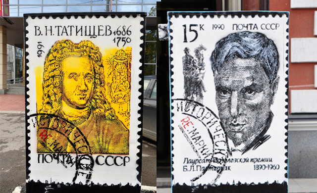 - В 2012 году в рамках фестиваля уличного искусства "Экология пространства" в Перми на улице Ленина на двух электрошкафах "Горэлектротранса", согласованно с собственником, были созданы две работы с изображением реальных почтовых марок. Работа, посвященная Василию Татищеву, официальному основателю Перми, расположилась в м/р "Разгуляй" - место, откуда исторически начинался город. Марка с Борисом Пастернаком обосновалась напротив дома купца Грибушина, описанyого в "Докторе Живаго" как дом с лепниной.
