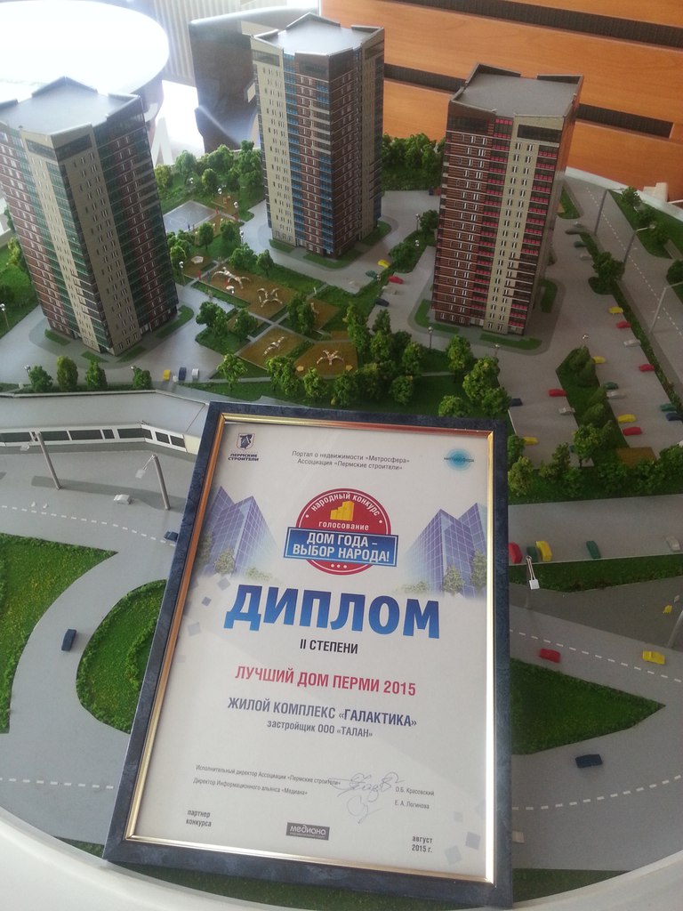 Жилой комплекс «Галактика» от компании «ТАЛАН» занял II место в конкурсе «Дом года – выбор народа!». Конкурс проводится в Перми каждый год Интернет-порталом «Метросфера». Экспертами в нем выступают жители нашего города. В этом году на победу претендовали 53 новостройки. «Галактику» поддержали более 600 пермяков. Покупать квартиру в жилом комплексе «Галактика» удобно.