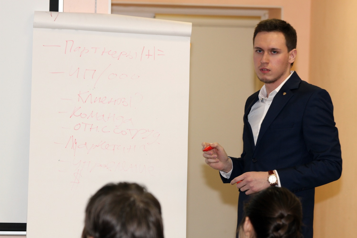 «Школа молодого предпринимателя» – проект, реализуемый студентами направления «Организация работы с молодежью» философско-социологического факультета ПГНИУ совместно с Пермским городским бизнес-инкубатором. На очередном занятии «Бизнес-моделирование и маркетинг» будущие предприниматели встретились с бизнес-тренером Русланом Хабибуллиным и успешным молодым бизнесменом Кириллом Даниловым, владельцем свадебного агентства «Хочу свадьбу» и управляющим базы отдыха «Зайкина избушка».