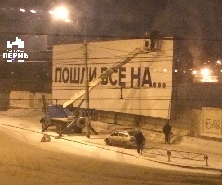 Минувшей ночью на билборде, установленном на площади Карла Маркса, появился баннер со словами «Пошли все на…» Пользователи предположили, что реклама имеет отношение к предстоящему «Финалу четырех», в котором примет участие БК «ПАРМА». Ранее на билборде был размещен баннер ФК «Амкар», а до этого – БК «Урал-Грейт».