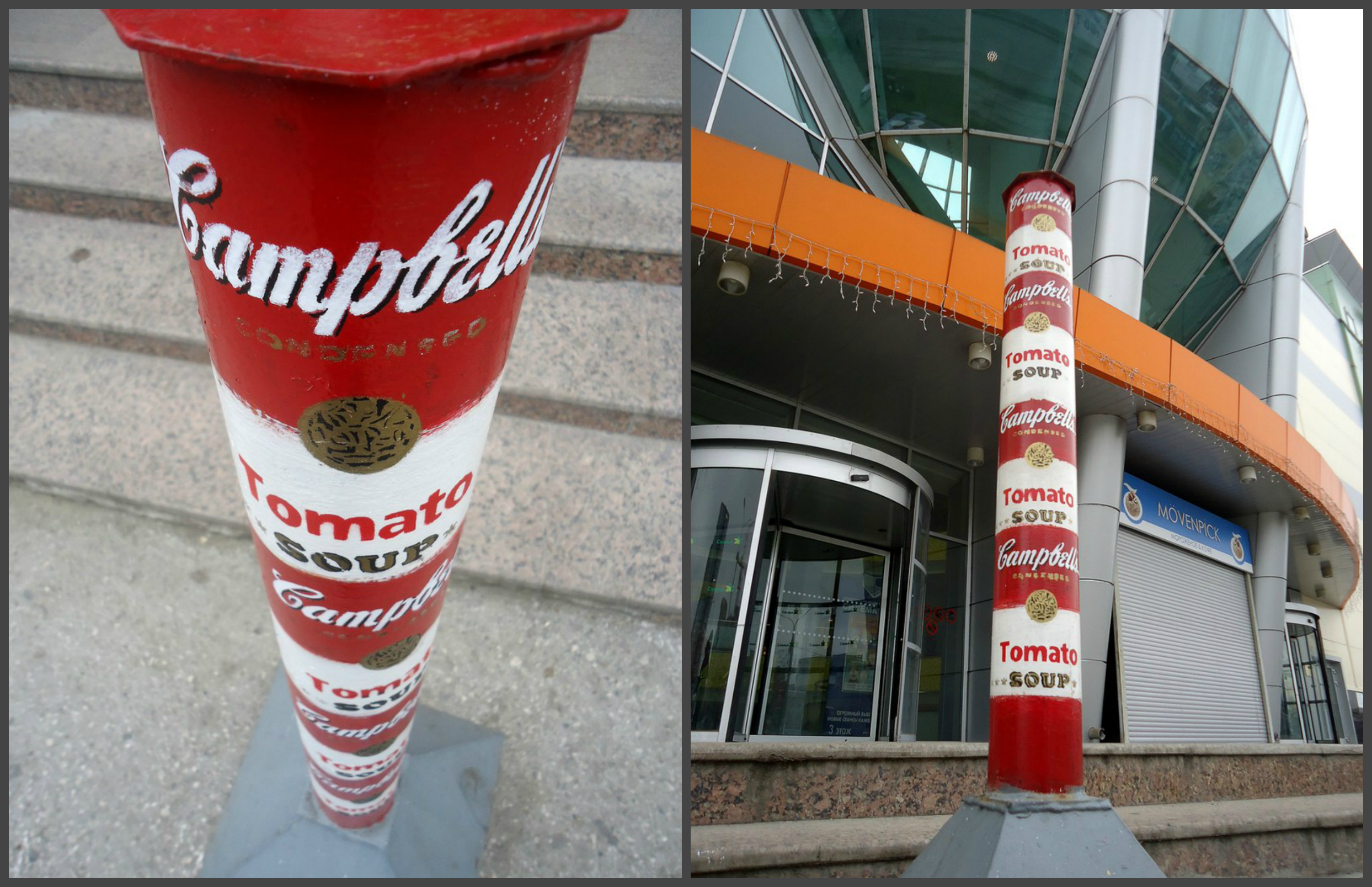 Пермский уличный художник Виктор Фрукты парковочные столбики у гипермаркета «СемьЯ» сделал похожими на работу популярного художника Энди Уорхола «Банки с супом Кэмпбелл».