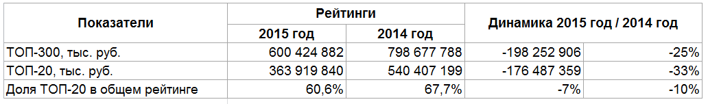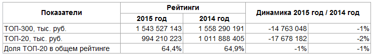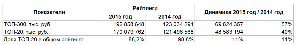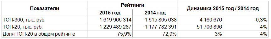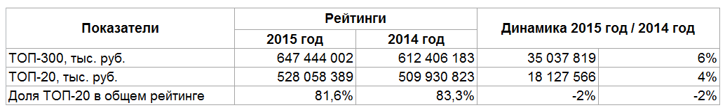 По ТОП-20 прирост показателя в 2015 году несколько скромнее: 4%, или 18,1 млрд руб., соответственно, доли двадцатки в общем рейтинге сократилась с 83,3% до 81,6%.