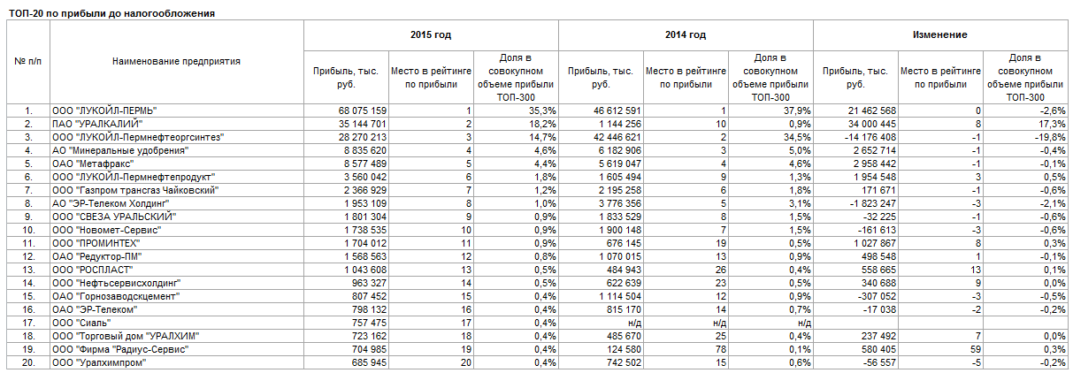 По итогам 2015 года ТОП-20 по прибыли покинули ЗАО «Газпром газораспределение Пермь» (21-е место, –8 позиций), ООО «НОВАТЭК – Пермь» (30-е место, –13 позиций), ЗАО «ПермТОТИнефть» (33-е место, –17 позиций), АО «ОДК» – Пермские моторы» (81-е место, –70 позиций), ООО «МетаТрейдинг» (нет в ТОП-300 по выручке).