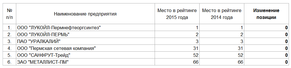 «Новичками» двадцатки 2015 года стали: ЗАО «ЛЫСЬВЕНСКИЙ МЕТАЛЛУРГИЧЕСКИЙ ЗАВОД» (16-е место, +5 позиций), ООО «Торговый Дом «Метафракс» (17-е место, +8 позиций), ОАО «Соликамскбумпром» (18-е место, +5 позиций), ОАО «АВИАДВИГАТЕЛЬ» (19-е место, +7 позиций), ПАО «Мотовилихинские заводы» (20-е место, + 26 позиций).