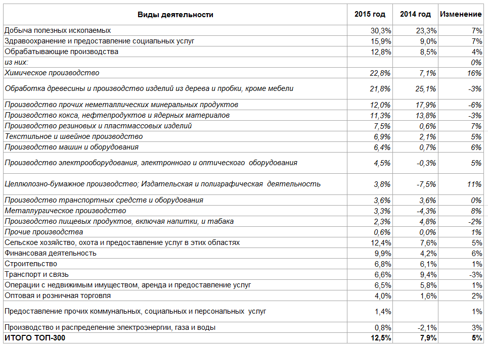 По видам экономической деятельности лучшие показатели рентабельности в последние годы – у добывающей промышленности. В 2015 году рентабельность продаж составила 30,3% (по сравнению с 2014 годом показатель увеличился на 7%). Увеличение рентабельности наблюдается практически по всем отраслям, исключение составляют транспорт и связь, а в составе обрабатывающей промышленности – обработка древесины и производство изделий из дерева, производство прочих неметаллических минеральных продуктов, производство кокса, нефтепродуктов и ядерных материалов, а также производство пищевых продуктов и табака.