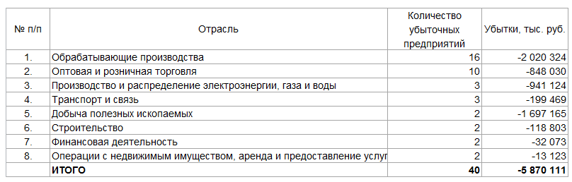 Наибольшее количество убыточных предприятий 2015 года сосредоточено в обрабатывающей промышленности (16 из 40 предприятий, суммарный убыток по ним составляет 2,0 млрд. руб.). Но лидер 2015 года по величине убытков – ООО «НСХ АЗИЯ ДРИЛЛИНГ» (–1,6 млрд руб.) – принадлежит к другой отрасли – «Добыча полезных ископаемых».