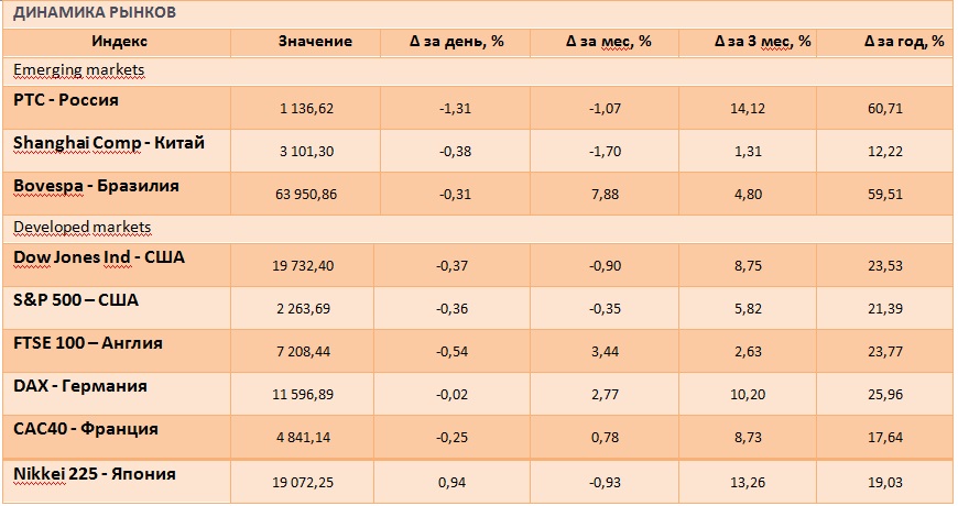 Мировые фондовые индексы продемонстрировали отрицательную динамику. Американские индексы снизились в пределах 0,36-0,37% в ожидании инаугурации Дональда Трампа. Европейские индексы снизились в пределах 0,02-0,54%. ЕЦБ по итогам прошедшего заседания сохранил базовую процентную ставку на рекордно низком уровне 0%, подтвердив объем выкупа активов в рамках программы количественного смягчения на уровне 80 млрд. евро ежемесячно вплоть до марта. Российский рынок (индекс ММВБ) снизился на 0,36%.
