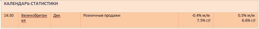 СТАТИСТИКА: Сегодня ожидается выход данных по розничным продажам в Великобритании за декабрь (прогноз -0,4%, значение за ноябрь 0,5%) (см. Календарь статистики)