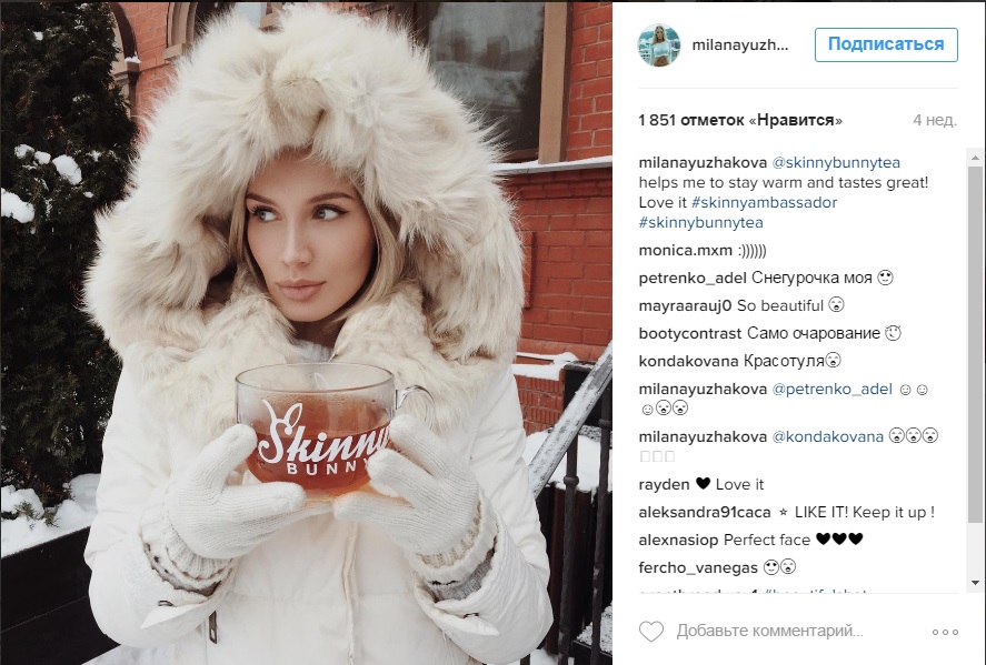 Другая пермская модель, Милана Южакова, стала известной после краткосрочного участия в шоу «Каникулы в Мексике-2» и музыкальной группе «Мандаринки», в которой агрессивный китч русской «попсы» вступил в термоядерную реакцию с феминистским посылом Pussy Riot. Милана всецело посвятила Instagram собственной персоне: подтянутая фигура обладательницы страницы занимает не менее 2/3 пространства каждого кадра. Девушка подписывает фотографии на английском языке, а среди 210 тысяч ее обожателей комментарии оставляют как англоязычные пользователи, так и русские. Впрочем, одинаково восхищенные.