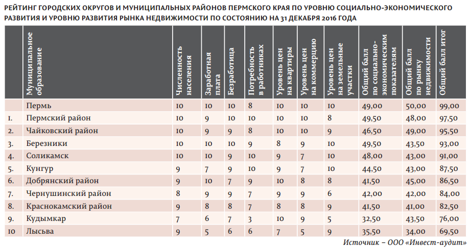 По итогам 2016 года в тройку лидеров удалось пробиться Чайковскому (в предыдущем исследовании занимал пятую строчку). «Березники и Соликамск уступили место Чайковскому муниципальному району в связи с тем, что уровень цен на данных территориях на жилую и коммерческую недвижимость в текущем исследовании ниже», – поясняет Егор Чурин, генеральный директор ООО «Инвест-аудит».
