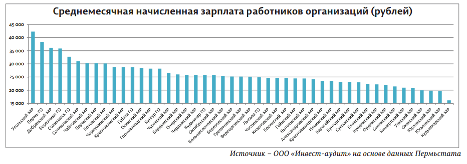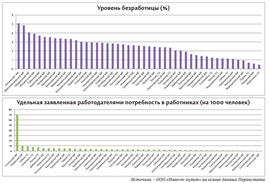 Самый высокий размер начисленной заработной платы зафиксирован в Усольском районе – 42,253 тыс. рублей. Более 30 тыс. рублей в среднем получают также работники в Перми, Березниках, Соликамске, Добрянском, Соликамском, Чайковском, Пермском и Кочевском районах. Минимальные уровни безработицы (менее 1%) зафиксированы в Березниках, Перми, Пермском и Верещагинском районах. Напротив, самые высокие показатели наблюдаются в Косинском, Красновишерском и Чердынском районах (более 4%), отмечают аналитики «Инвест-аудит».
