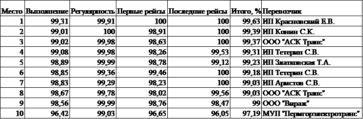 МКУ «Гортранс» опубликовало рейтинг перевозчиков за IV квартал 2016 года. Места перевозчиков в нем зависят от нескольких критериев, закрепленных в договоре с администрацией. В рейтинг вошел общественный транспорт города Перми за исключением маршруток – всего 80 маршрутов. Согласно условиям контракта, показатели количества совершенных рейсов и их регулярность на каждом отдельно взятом маршруте должны быть не ниже 90%. Самые ранние и поздние выходы необходимо выполнить как минимум на 95%. За нарушения этой части договора на протяжении двух месяцев подряд перевозчик может лишиться работы.
