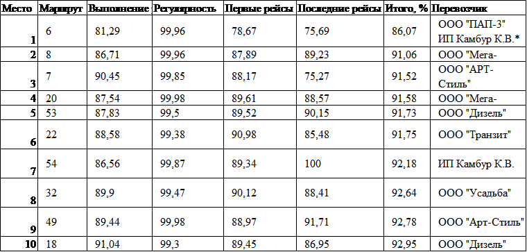 * На данном маршруте за квартал работали два перевозчика. ПАП-3 работал на маршруте в сентябре (показатели: выпуск 90,03%, регулярность 99,94), октябре (94,31%, 99,90%) и с 1 по 20 ноября (91, 57%, 99,90%). ИП Камбур работал с 21 по 30 ноября (показатели: 63,66% и 100%) и в декабре (показатели: 68,15%, 100%).