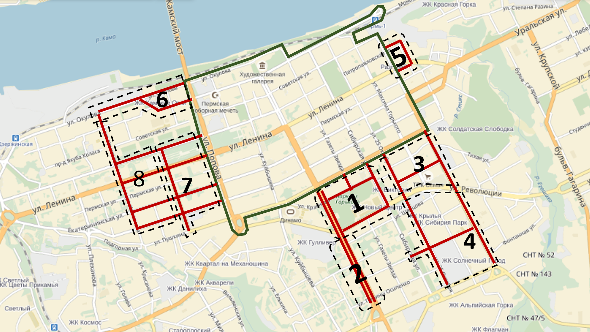 Пунктирной черной линией обозначены участки улично-дорожной сети, предлагаемые для включения в зону платной парковки.