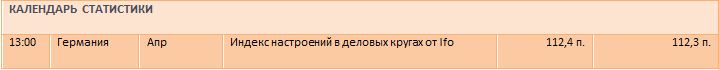 СТАТИСТИКА: Сегодня ожидается выход данных по индексу настроений в деловых кругах Германии за апрель (прогноз 112,4 п., значение за март 112,3 п.) (см. Календарь статистики)
