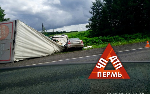 По предварительным данным, 60-летний водитель грузового автомобиля DAF, двигаясь в сторону Нытвы, на 452 км выехал на полосу встречного движения, где допустил столкновение с автомобилями «Хендай Элантра» и ВАЗ-217010. В результате 44-летний водитель иномарки и его 23-летний пассажир от тяжелейших травм скончались на месте.