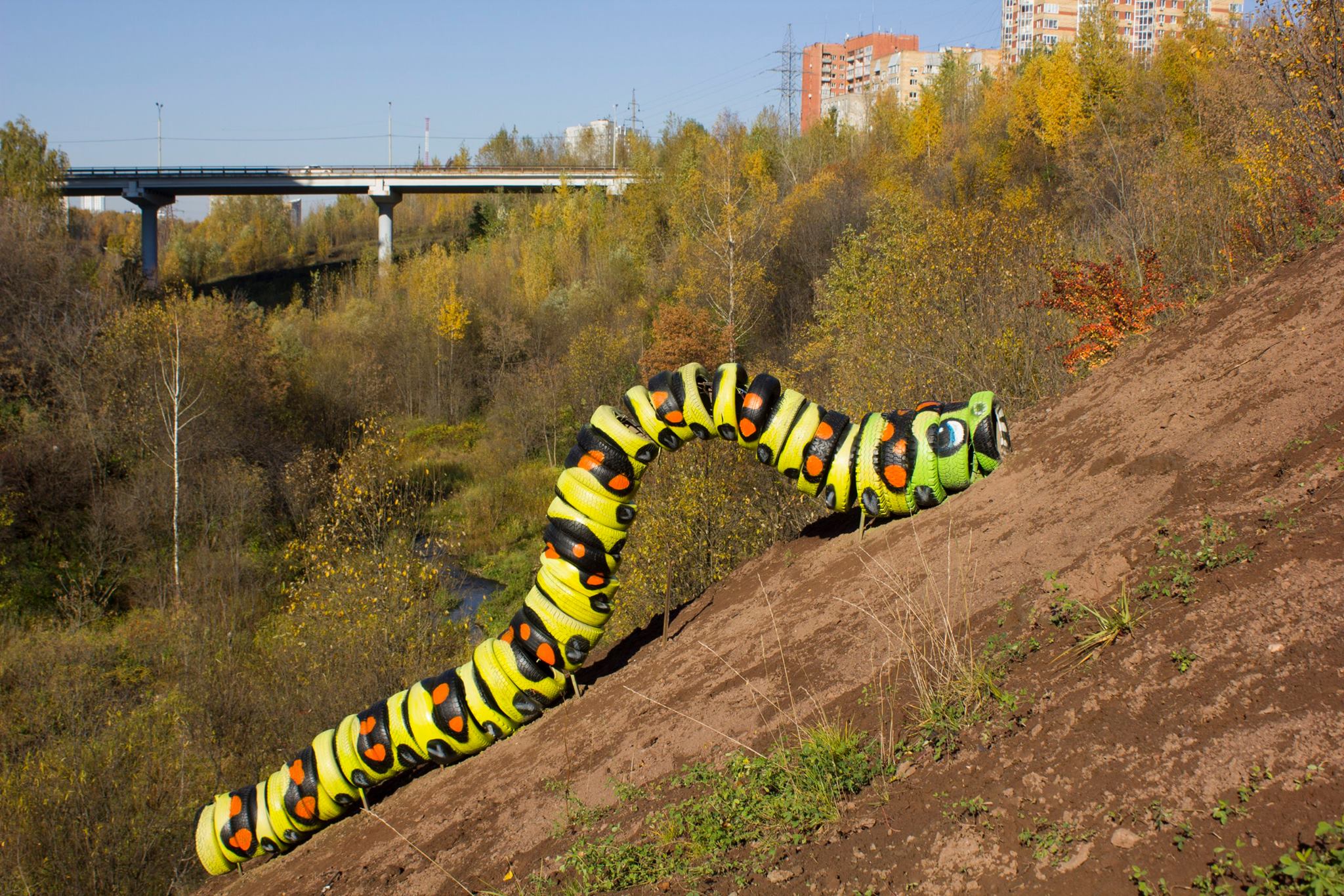 Александр Жунев закончил работу над новым арт-объектом. Из автомобильных покрышек, брошенных в овраг в долине реки Егошиха, художник сделал гусеницу. Она символизирует, как медленно и трудно поднимать по склону скапливающийся там мусор. «А делать это просто необходимо, иначе ухудшающаяся экологическая обстановка заставит нас в гораздо более грубой форме», – призывает Александр Жунев.