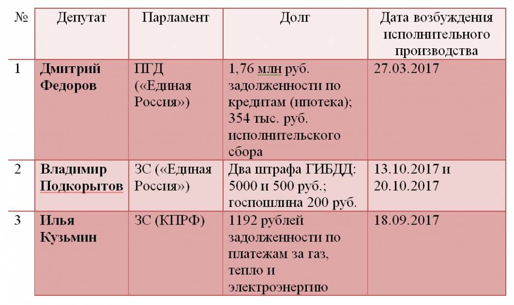 Согласно информации сайта Федеральной службы судебных приставов, не все депутаты Пермской городской думы и краевого Законодательного собрания вовремя оплачивают накопившиеся штрафы и просрочки по кредитам. Из всех проверенных в открытой базе ФССП краевых и городских депутатов трое оказались должниками.