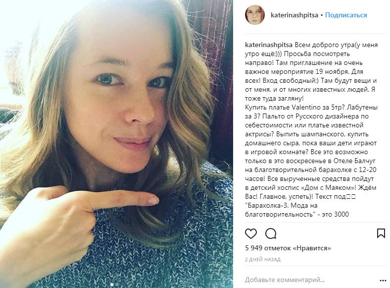 19 ноября известная российская актриса из Перми Екатерина Шпица прорекламировала благотворительную акцию. Пост с приглашением девушка выложила в своем Instagram-аккаунте. «Там будут вещи и от меня, и от многих известных людей. Я тоже туда загляну! Все вырученные средства пойдут в детский хоспис «Дом с Маяком»! Ждём Вас! Главное, успеть!, - написала актриса под фото.