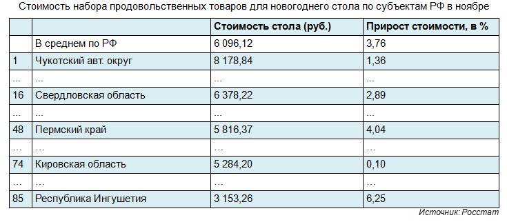 Больше всего на продукты к празднику придется потратить жителям Чукотского автономного округа, более 8,178 тыс. рублей. В Свердловской области новогодний стол обойдется почти в 6,5 тысяч. В еще одной соседней Кировской области показатель на уровне 5 тысяч. Наименьшая стоимость продуктов для новогоднего стола оказалась в Республике Ингушетия, чуть больше трех тысяч рублей.