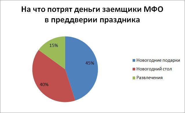 Согласно отчету мониторинга заемщиков «Домашние деньги», 45% от одобренной суммы люди собираются потратить на подарки, еще 40% – на новогодний стол и порядка 15% – на развлечения в период каникул (кино, театр, рестораны и кафе).