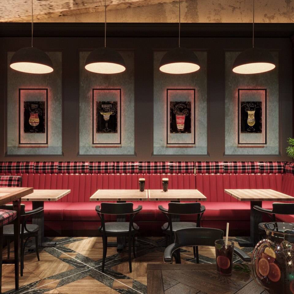 Первый этаж оформлен рассчитан на гостей, пришедших поужинать или провести вечер. На втором этаже заведения обустроено три тематические зоны: для просмотра спортивных мероприятий, прослушивания концертов культовых музыкантов и активных игр( дартс, настольный футбол).