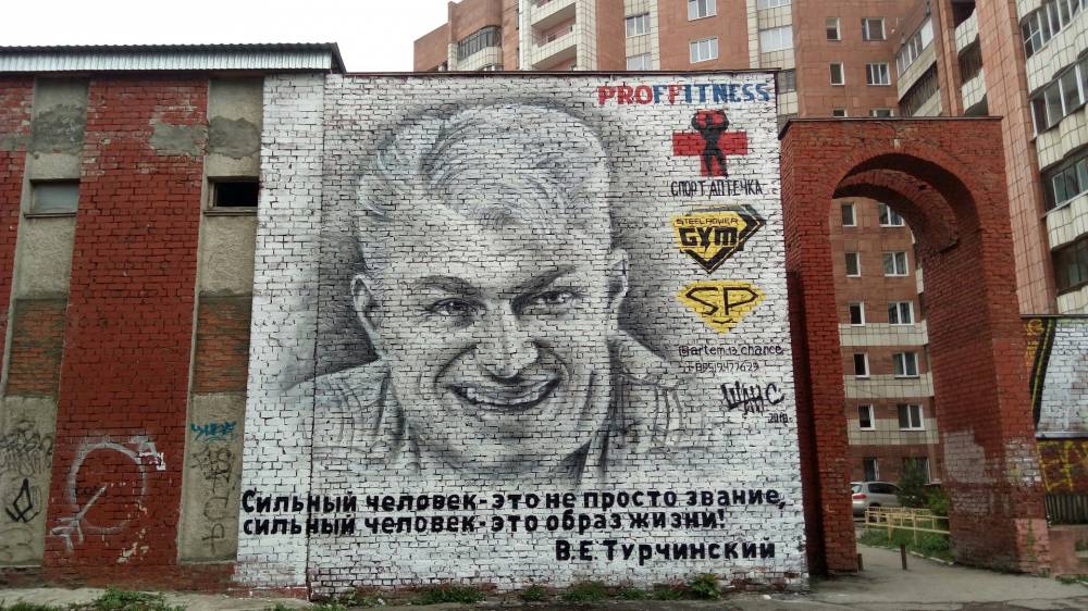 Как рассказал автор корреспонденту Business Class, место для работы было выбрано еще год назад. «Выбор сразу упал на Владимира Турчинского, потому что, помимо того, что я сам за спорт и за его продвижение в массы, так еще звезды сошлись, что третьего числа в рамках пермского международного марафона пройдут соревнования по функциональному многоборью (кроссфит) и силовой атлетике (стронгмен)», – рассказывает художник. Рисунок выполнен из водоэмульсионки и баллончиков с краской.