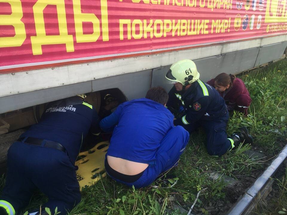 Водитель позвонил в ГИБДД и в скорую помощь. На место прибыли и специалисты «Пермской городской службы спасения», им пришлось деблокировать мужчину из под трамвая. Прибывшие врачи установили, что мужчина получил множество травм головы и тела, его госпитализировали.