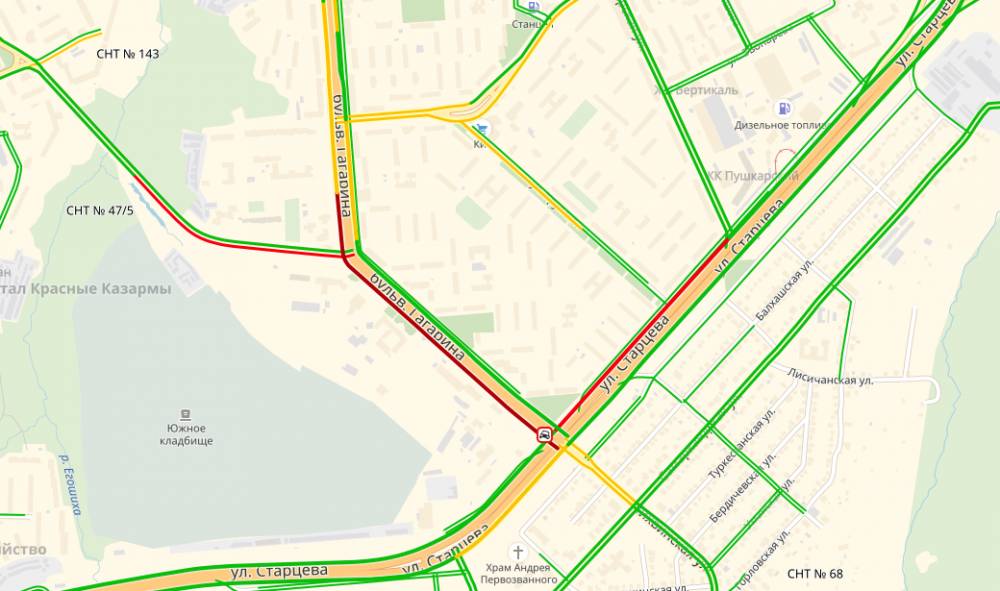Как сообщает Пермская дирекция дорожного движения, в результате столкновения автобуса и легкового автомобиля, на бульваре Гагарина и на улице Старцева образовалась пробка, движение перекрыто в обе стороны. Автомобили на этом участке дороги движутся со скоростью пять километров в час.