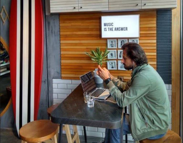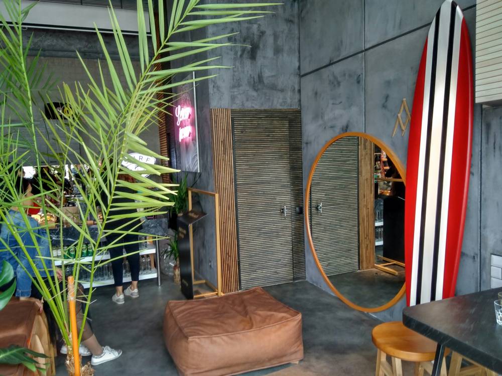 Для оформления интерьера использованы доски для серфинга, отражающие концепцию сети. В помещении установлены четыре стола. У гостей также есть возможность понаблюдать за работой бариста: зона кухни, где проходит приготовление кофе, ничем не отделена от гостей.