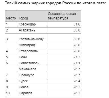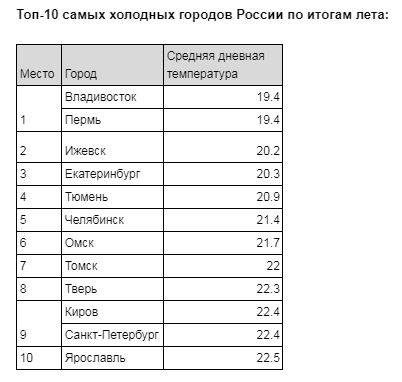 В десятку холодных городов попали: Ижевск, Екатеринбург, Тюмень, Челябинск, Омск, Томск, Тверь, Киров, Санкт-Петербург, Ярославль. Средняя температура воздуха в этих городах оказалась от +20,2 до +22,5 градусов.