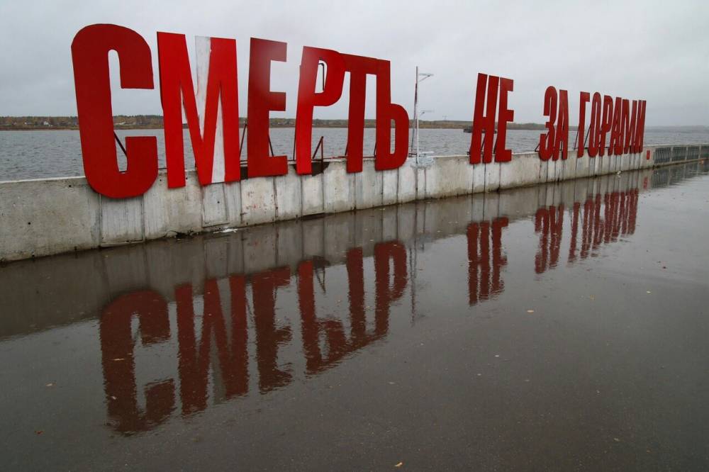 В ночь с 10 на 11 октября в Перми неизвестные изменили надпись «Счастье не за горами» на «Смерть не за горами». Объект расположен на набережной Камы.
