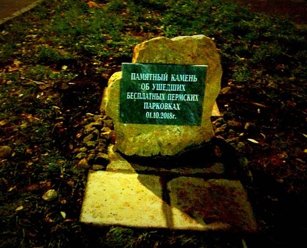 Фотографиями поделились местные жители в социальных сетях. На памятнике высечена фраза «Памятный камень об ушедших бесплатных пермских парковках 01.10.2018». Плита находится рядом с домом на ул. Тимирязева, 59.