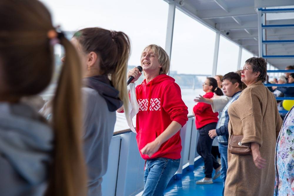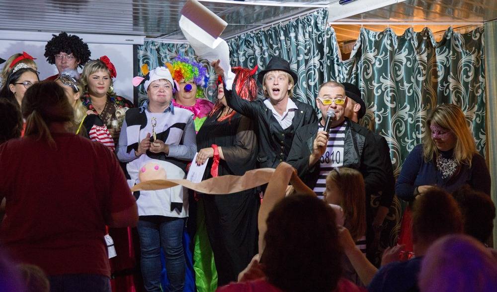 Наш рейс тематический – карнавальный, поэтому в образах не только аниматоры, но и многие пассажиры. Не растеряться среди ярких взбудораженных людей помогает четкое расписание. После отправления и ужина есть время ознакомиться с информацией об экскурсионных турах в Чайковском и по желанию их приобрести. Затем дети отправляются смотреть мультфильмы в кают-компании, а взрослые – в концертный зал.