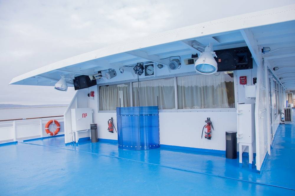 На нижней палубе рецепция с холлом, на одной из стен расположен экран, на карте в режиме реального времени можно наблюдать, где проходит теплоход в данный момент. Там же можно найти расписание, чтобы не пропустить ничего интересного. Мероприятий бывает много, рекорд – семь в разных «локациях» одновременно. Помимо конкурсов, театральных и музыкальных представлений проводятся различные мастер-классы: по танцам, рукоделию и даже самообороне, интеллектуальные игры.