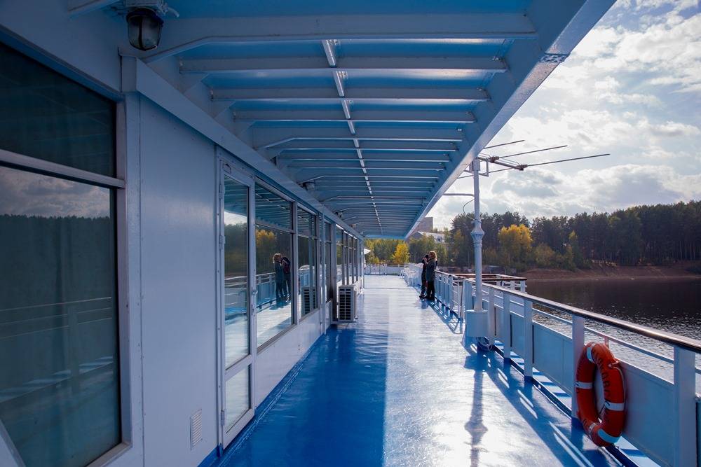 Выше, на средней палубе, в кормовой части располагается ресторан «Кама». Возле него находится сувенирный магазин, в течение рейса его ассортимент обновляется. В носовой части – зал отдыха с книгами, настольными играми, телевизором. Связь спутниковая и «ловит» везде, но программа круизов построена так, что времени на сериалы и новости остается немного. «Путешественники все больше привыкают только смотреть со стороны на происходящее и не участвовать. С каждым годом становится сложнее раскрепостить людей, но мы видим отдачу, когда это происходит», – рассказывает Константин