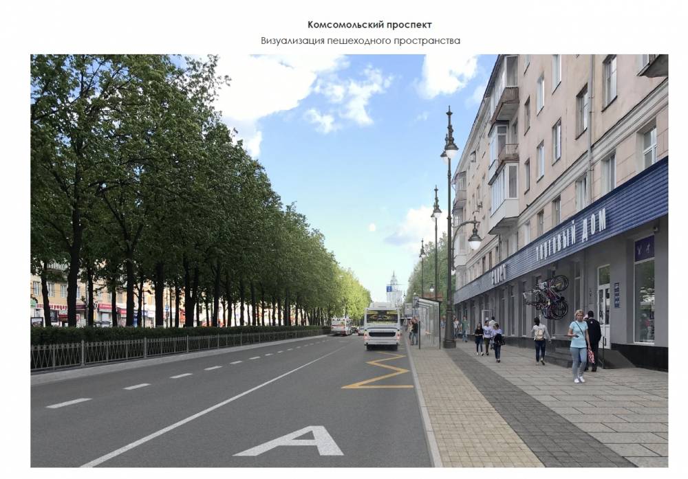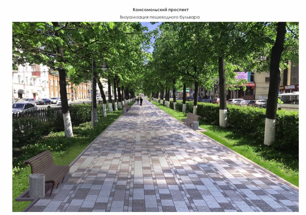 Проезжая часть останется трехполосной в оба направления. На протяжении всего Комсомольского проспекта будут упорядочены парковочные места. Проект предусматривает ремонт бульварной части: здесь будет заменено покрытие на гранит, установлены скамейки, урны и торшерные опоры освещения. Опоры наружного освещения на тротуарной части будут сохранены в историческом виде в чугуне. Также будет устроена система ливневой канализации, что позволит избавить Компрос на пересечении с улицей Советской от застаивания воды в период сильных дождей.