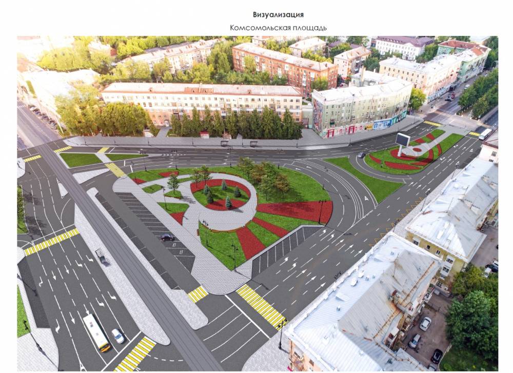 На Октябрьской площади появится пешеходная аллея. В специальных кадках будут высажены деревья. На время массовых праздничных мероприятий кадки будут убираться, поэтому сохранится основное назначение площади. На площади также предусмотрена парковка автомобилей. На Комсомольской площади появится зона отдыха с зелеными насаждениями.