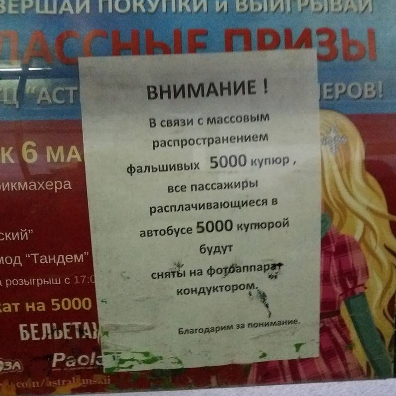 В связи с пресечением попытки мошенничества в автобусах появилось объявление о том, что пассажиры, расплачивающиеся пятитысячной купюрой, будут сфотографированы кондуктором. В частности, подобное заявление висит в автобусе №64.