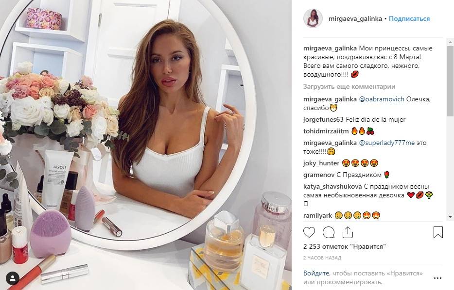 Модель Галинка Миргаева, которую еще называют «пермской Анджелиной Джоли», поздравила своих подписчиц с 8 марта. В своем аккаунте в «Инстаграм» она выложила фотографию с букетом и поздравлением.