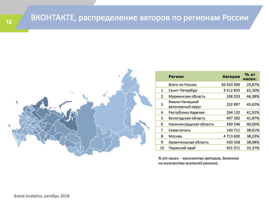 Процент населения России, пользующегося соцсетями (не путать с посещаемостью), по данным WeAreSocial/HootSuite Global Research 2019.