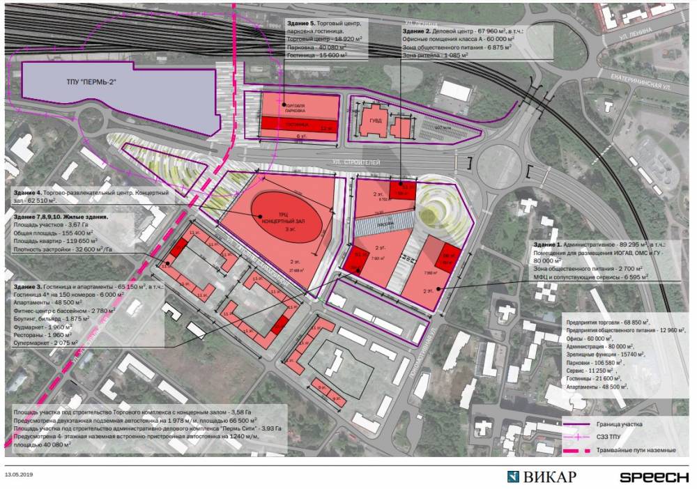 От пешеходной площади на запад – к торгово-зрелищному комплексу, ведет пассаж, а на юг уходит улица к жилым зданиям. Двухэтажный торгово-развлекательный центр и расположенный над ним концертный зал займут площадь 62,5 тыс. кв. м. Предусмотрена подземная стоянка на 1978 машиномест. Жилые здания будут построены на участке 3,7 га. Общая площадь квартир составит 119,6 тыс. кв. м. По другую сторону от улицы Строителей находится транспортно-пересадочный узел Пермь II, многофункциональный комплекс, который включает в себя торговый центр (18,9 тыс. кв. м), парковку (40 тыс. кв. м) и гостиницы (13,6 тыс. кв. м, 12 этажей). С ним будет соседствовать здание ГУ МВД по Пермскому краю.