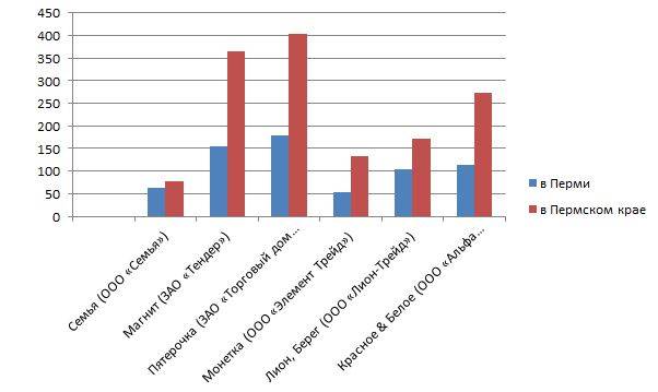 Однако в Перми доля присутствия «Семьи» выше некоторых федеральных сетей. По итогам прошлого года в краевой столице пермская компания имела долю 9,49%. Это больше, чем у «Магнита» (8,77%), «Монетки» (2,73%), «Лиона» и «Берега» (2,60%) и «Красное & Белое» (3,48%). При этом в остальных территориях доля «Семьи» на рынке ниже, чем в Перми.