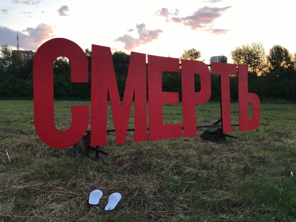 Художник из Перми Алексей Илькаев, работающий под псевдонимом Sad Face, создал новую работу в Екатеринбурге. В рамках партизанского фестиваля уличного искусства «Карт-бланш» он установил на пустыре арт-объект «Смерть». Буквы, выполненные в стилистике пермского «Счастья не за горами», дополнены белыми тапками.