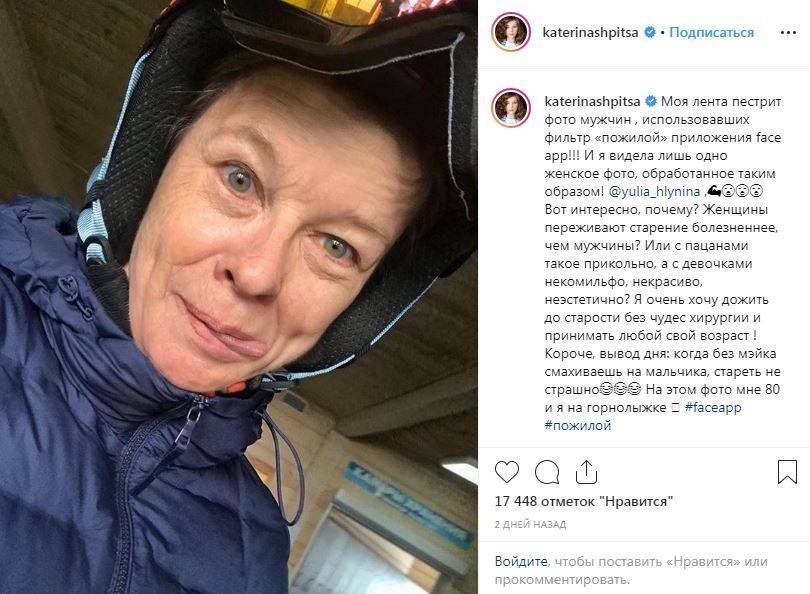 Также во флешмобе поучаствовала актриса из Перми Катерина Шпица. Она заметила, что женщина реже выкладывают «отредактированные» фото. «Вот интересно, почему? Женщины переживают старение болезненнее, чем мужчины? Я очень хочу дожить до старости без чудес хирургии и принимать любой свой возраст», – заявила пермячка.
