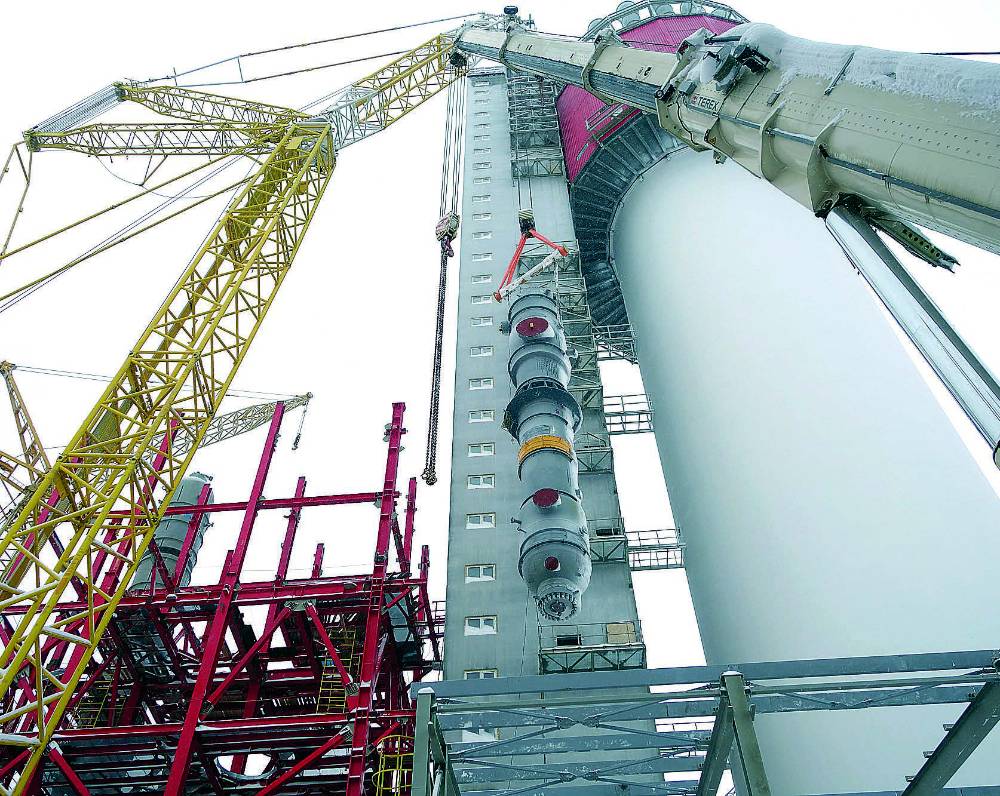 Подготовительные работы к основным операциям по монтажу агрегата начались в начале января. Подъем и монтаж конденсатора на высоте 44 метров с помощь двух кранов грузоподъемностью 600 и 250 тонн осуществили специалисты генерального подрядчика строительства комплекса АКМ компании «Уралэнергострой» и представители субподрядных организаций.